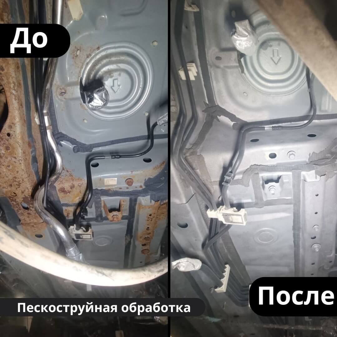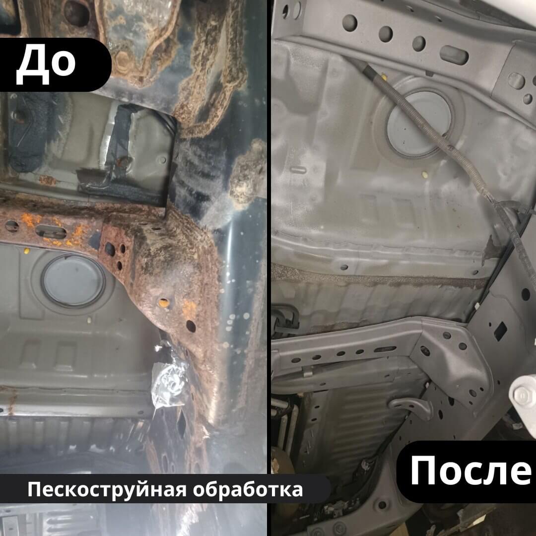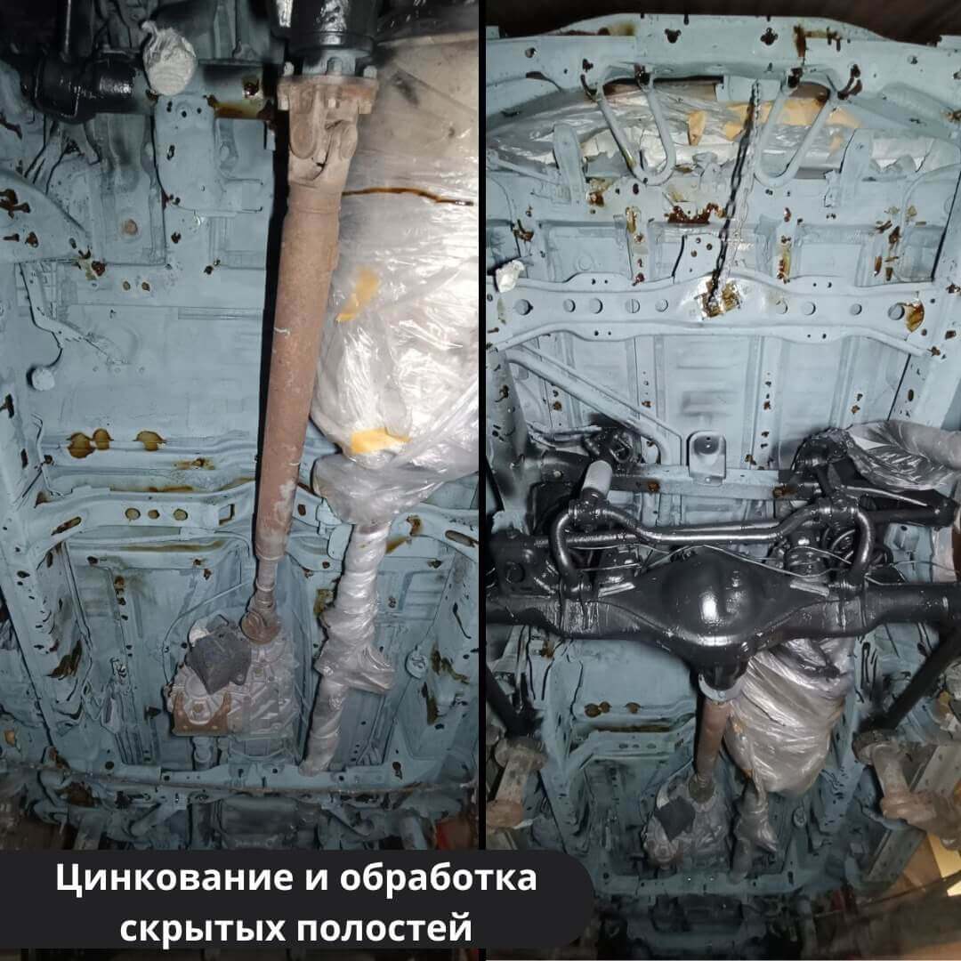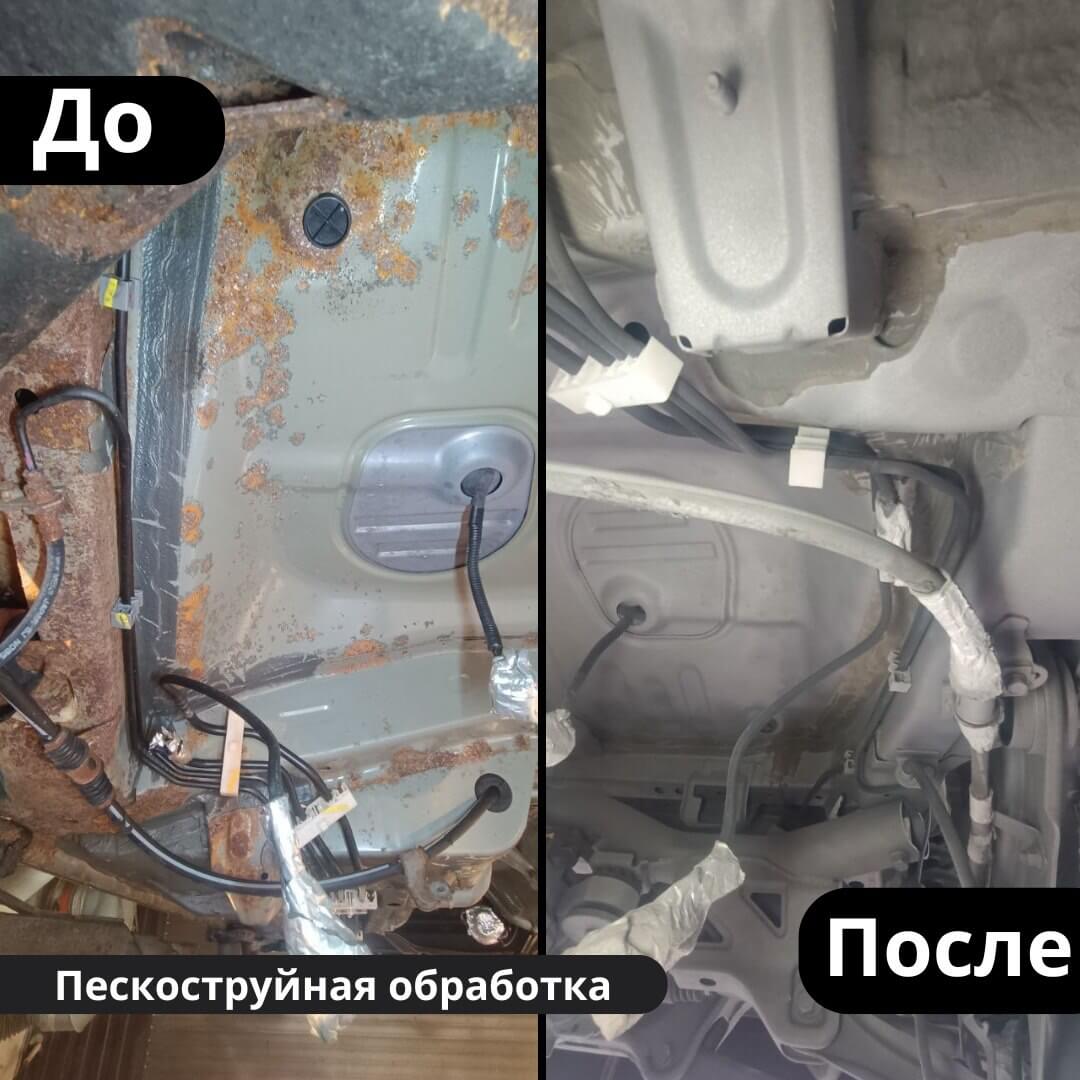 После мойки и сушки мы обнаружили местами очаги поверхностной коррозии, которые устранили методом пескоструйной обработки. Далее произвели цинкование и обработку скрытых полостей, сварных швов и точек. После этого на автомобиль нанесли антикоррозийный состав премиального уровня.
