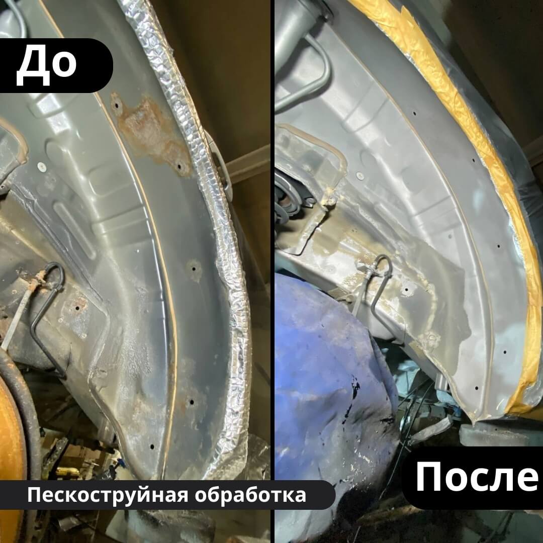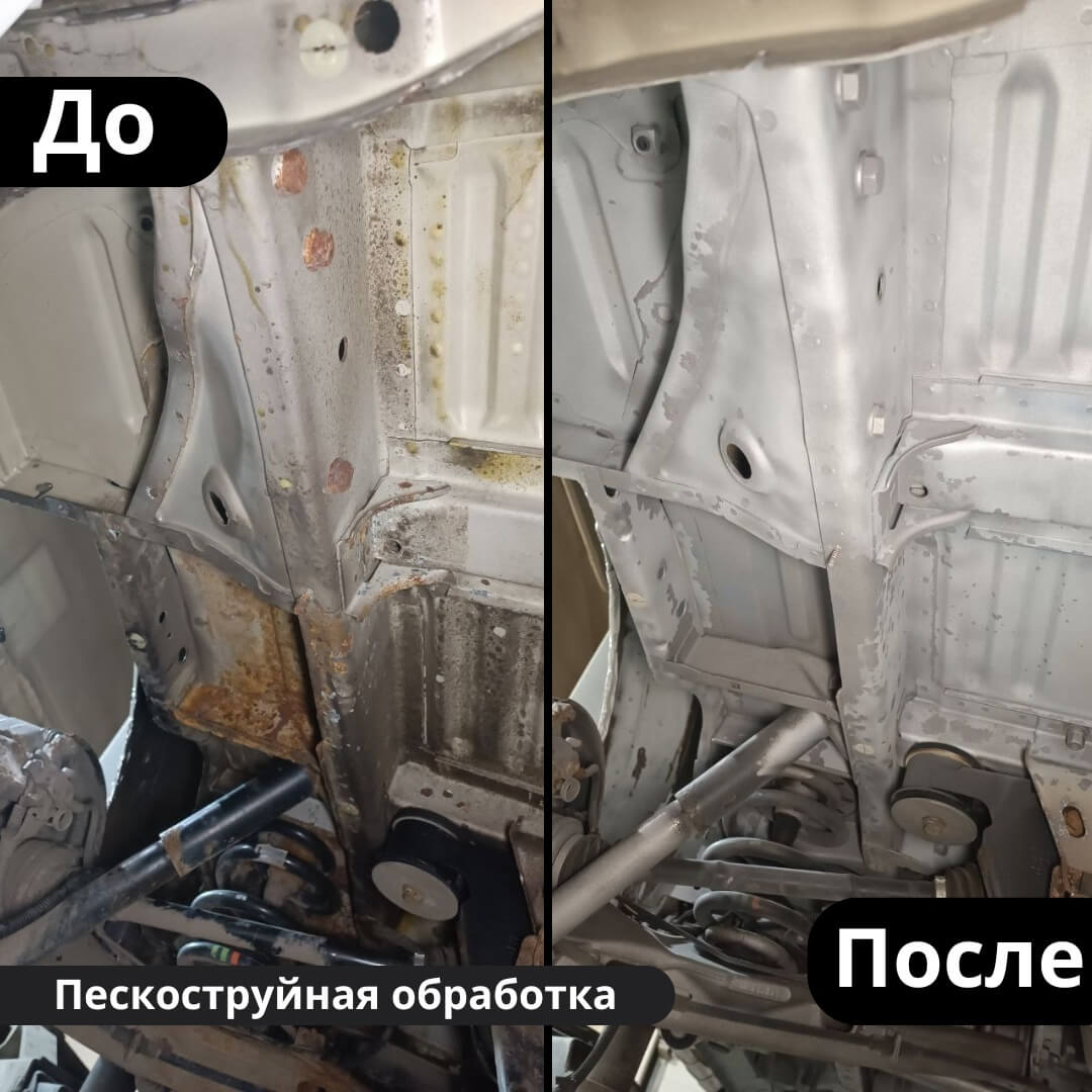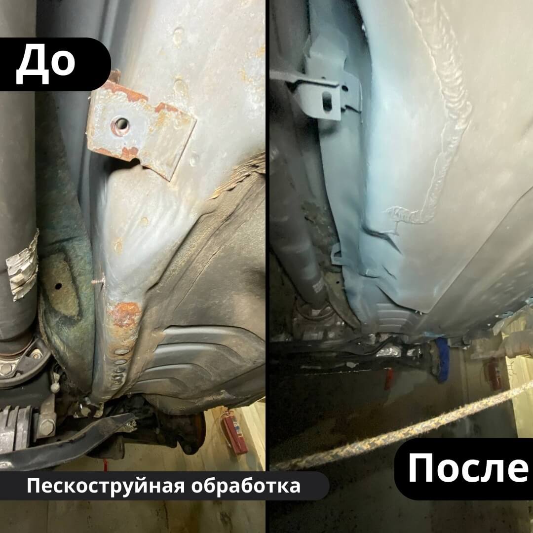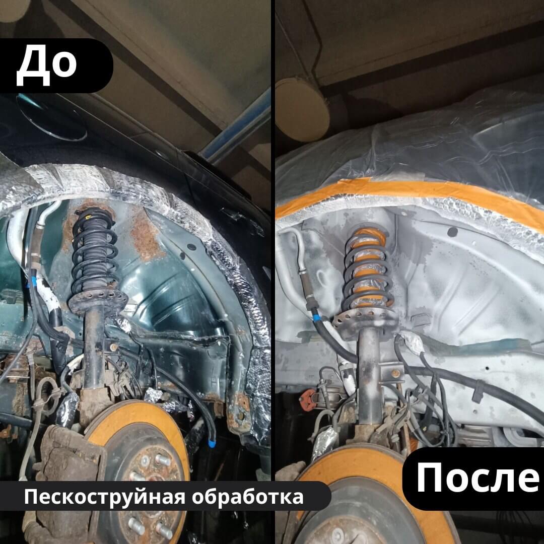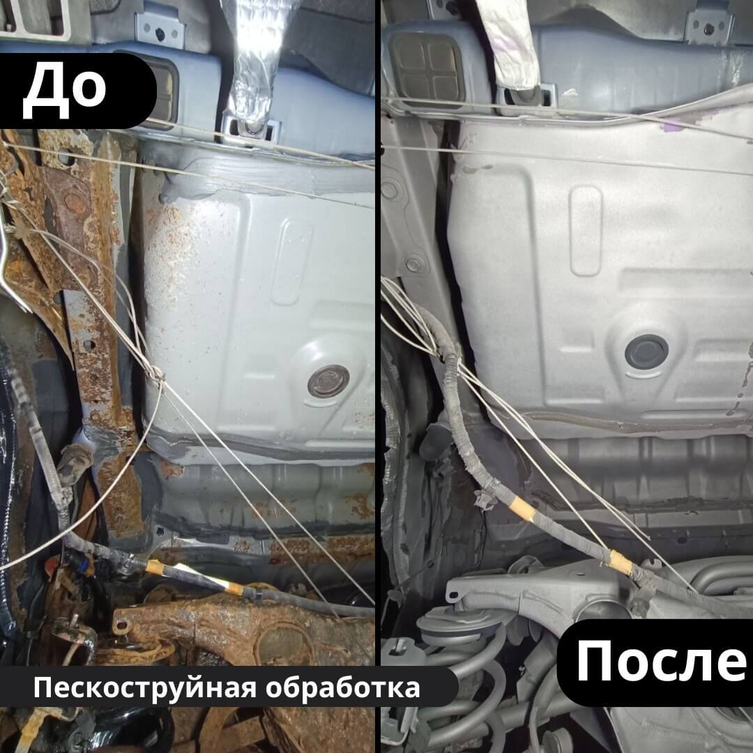 После мойки и сушки мы обнаружили местами очаги поверхностной коррозии, которые устранили методом пескоструйной обработки. Далее произвели цинкование и обработку скрытых полостей, сварных швов и точек. После этого на автомобиль нанесли антикоррозийный состав премиального уровня.