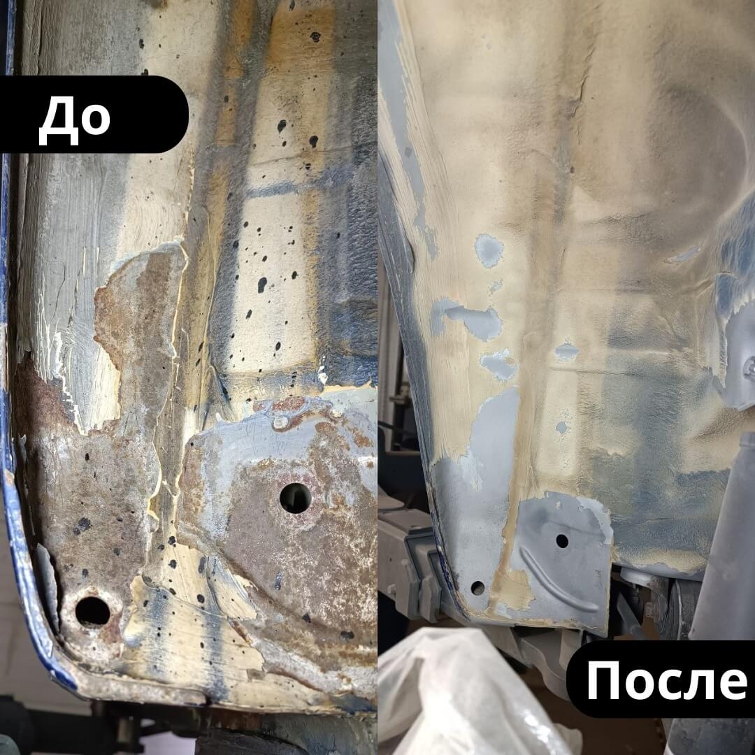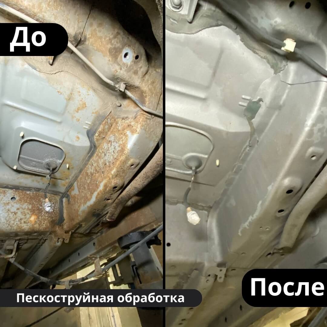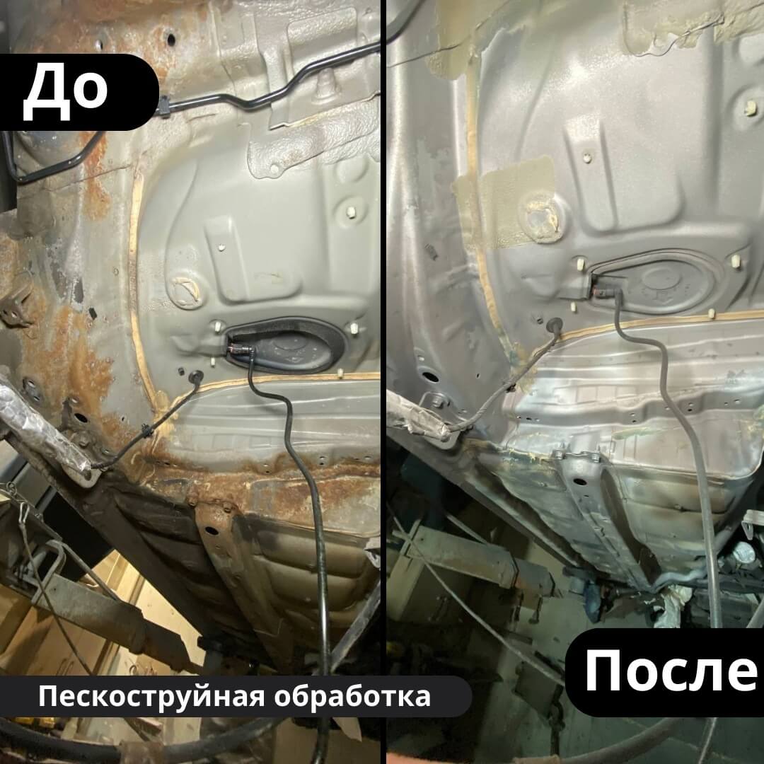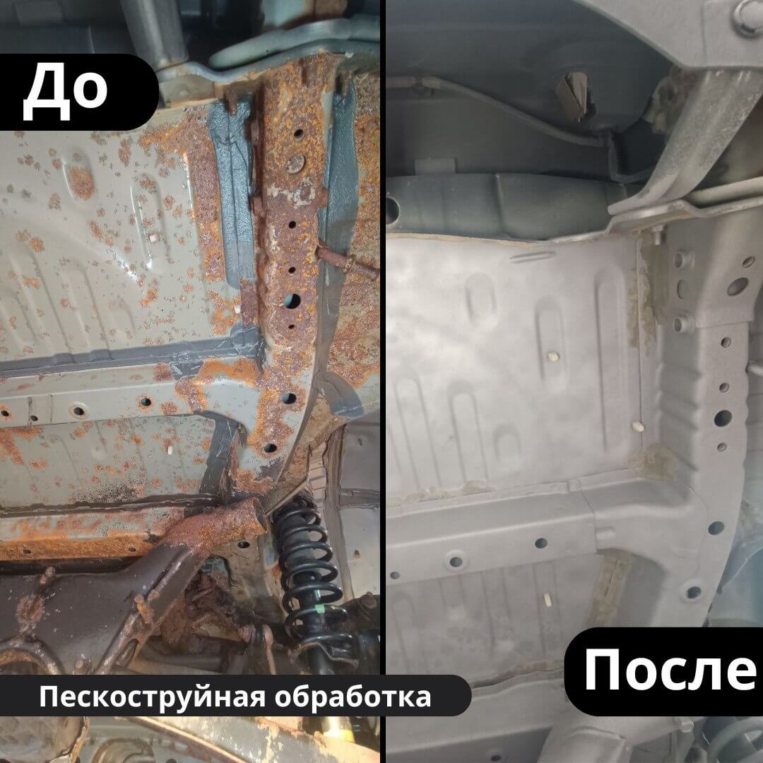 После мойки и сушки мы обнаружили местами очаги поверхностной коррозии, которые устранили методом пескоструйной обработки. Далее произвели цинкование и обработку скрытых полостей, сварных швов и точек. После этого на автомобиль нанесли антикоррозийный состав премиального уровня.