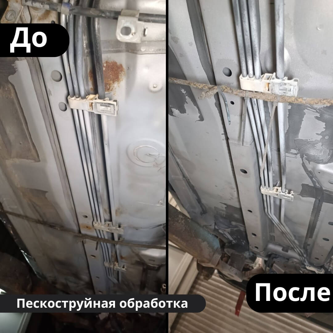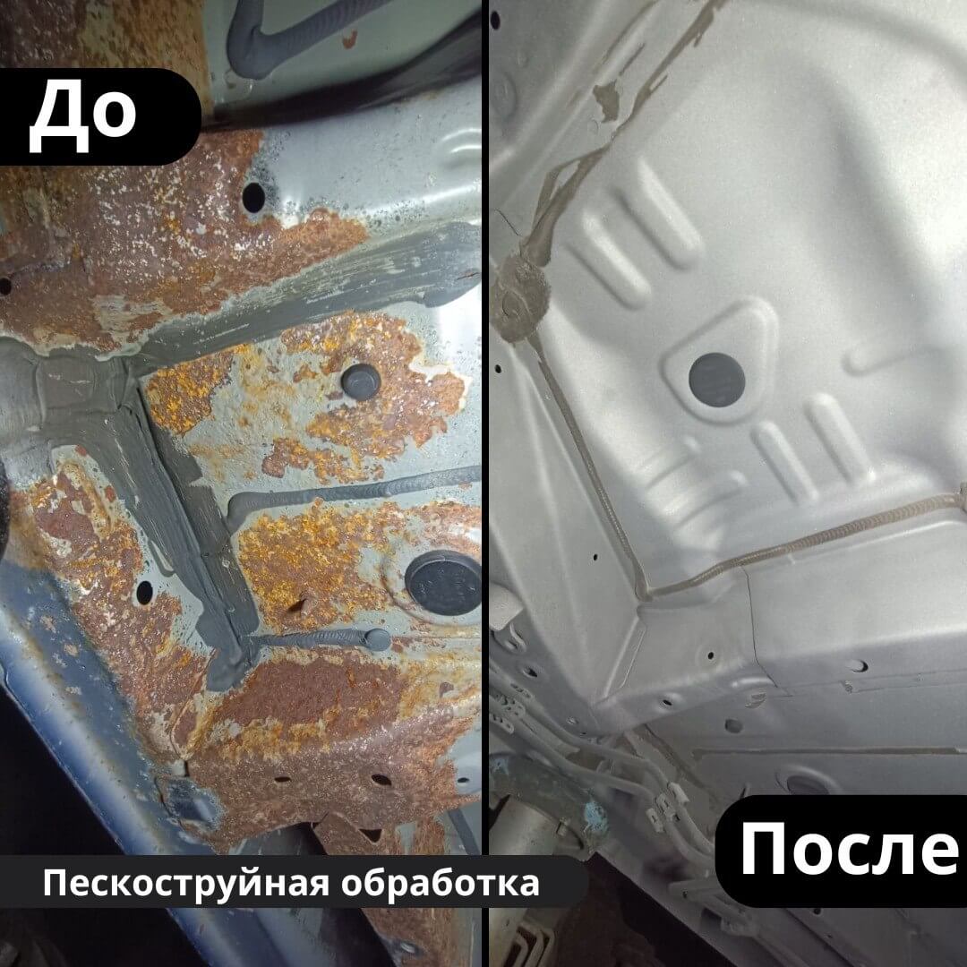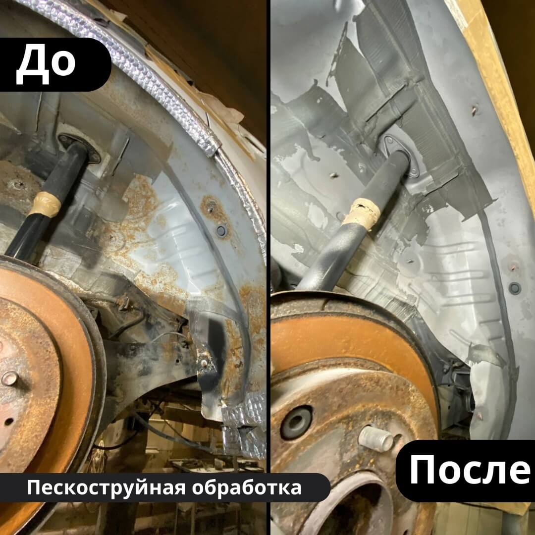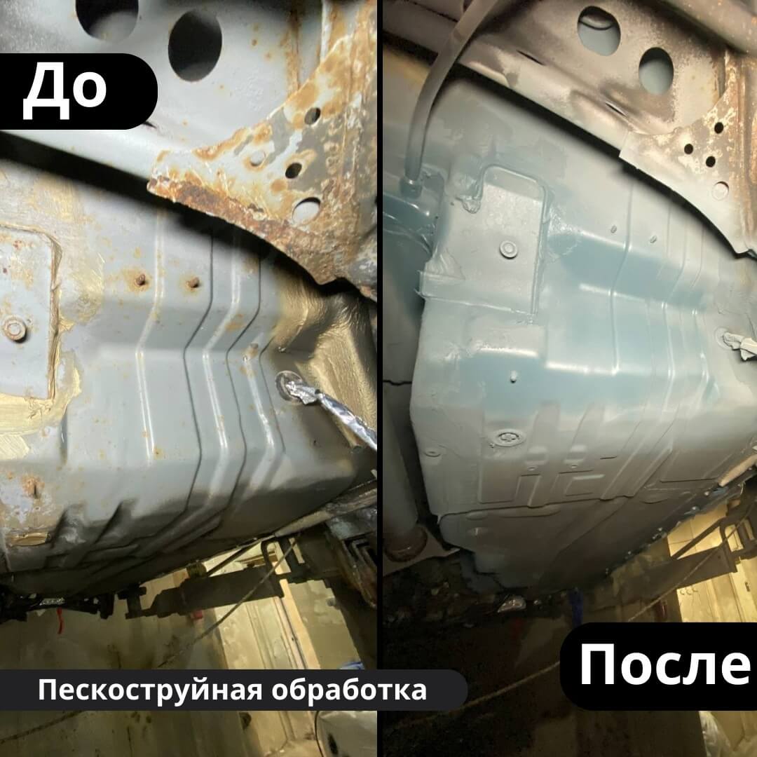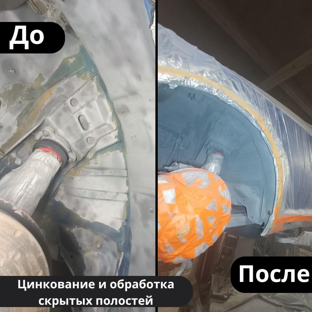 После мойки и сушки мы обнаружили местами очаги поверхностной коррозии, которые устранили методом пескоструйной обработки. Далее произвели цинкование и обработку скрытых полостей, сварных швов и точек. После этого на автомобиль нанесли антикоррозийный состав премиального уровня.
