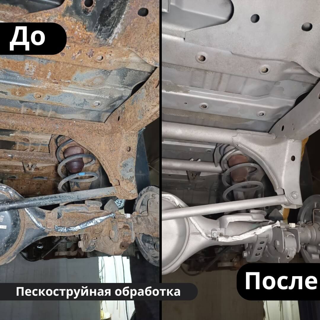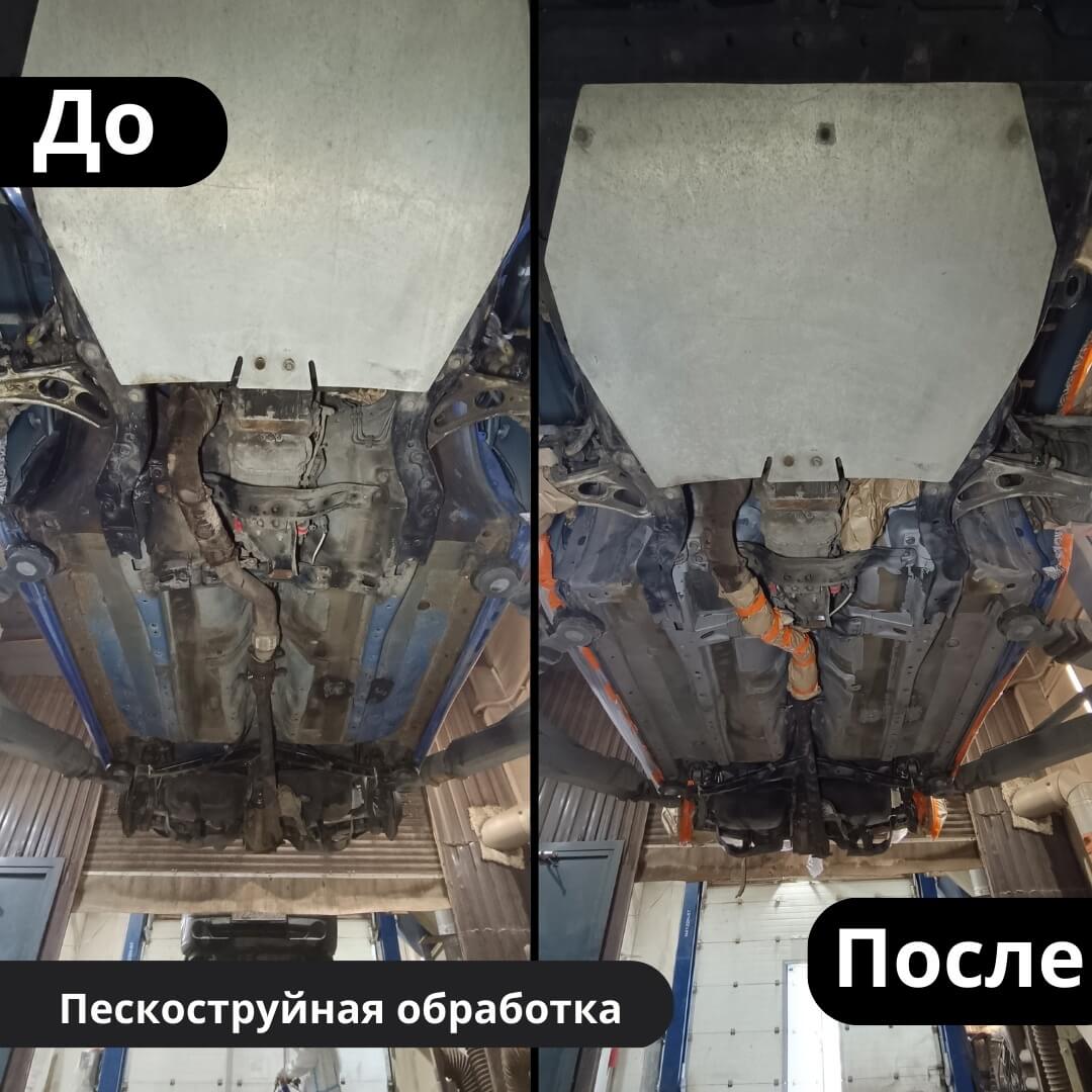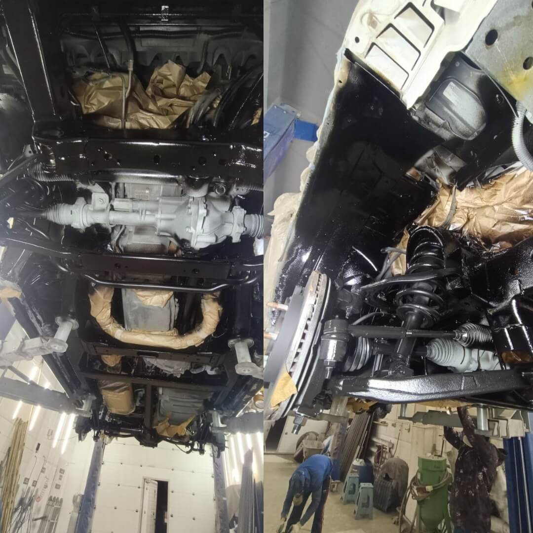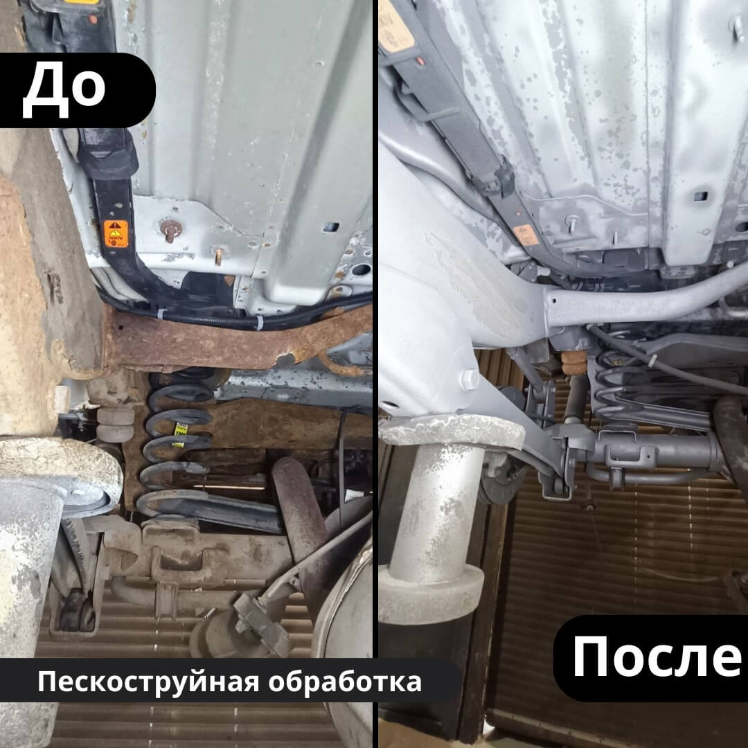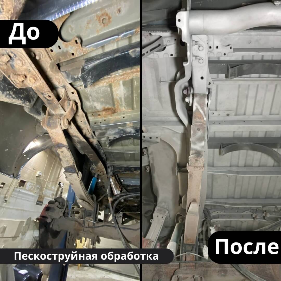 Мы произвели следующие работы: 1. Мойка с разбором и сушка 2. Пескоструйная обработка днища 3. Цинкование 4. Обработка скрытых полостей 5. Антикоррозийная обработка 6. Покраска подвески