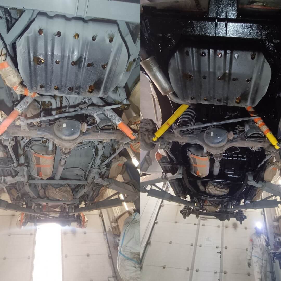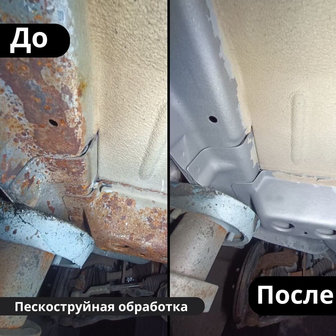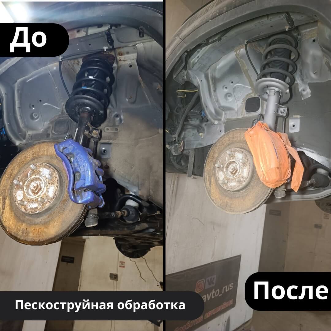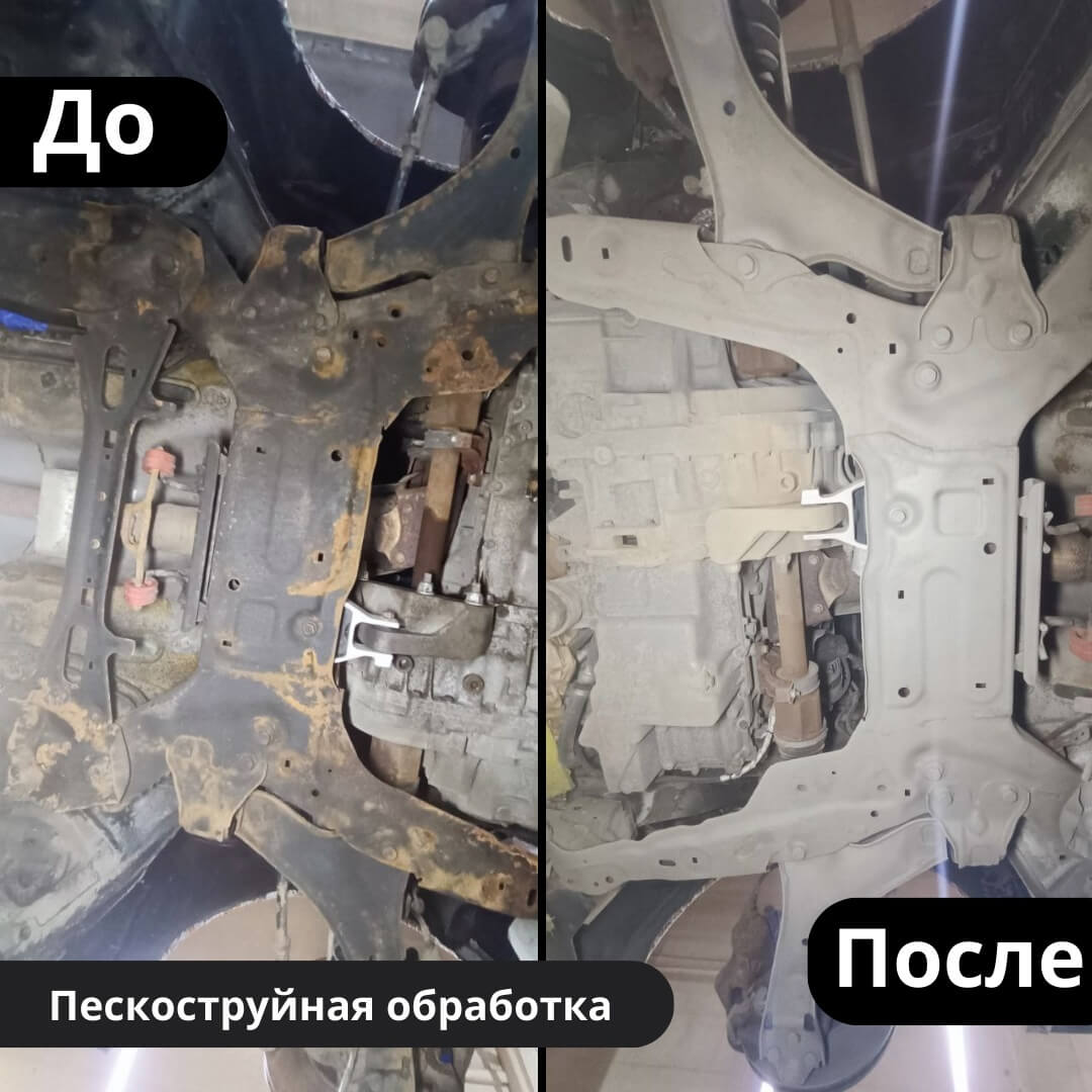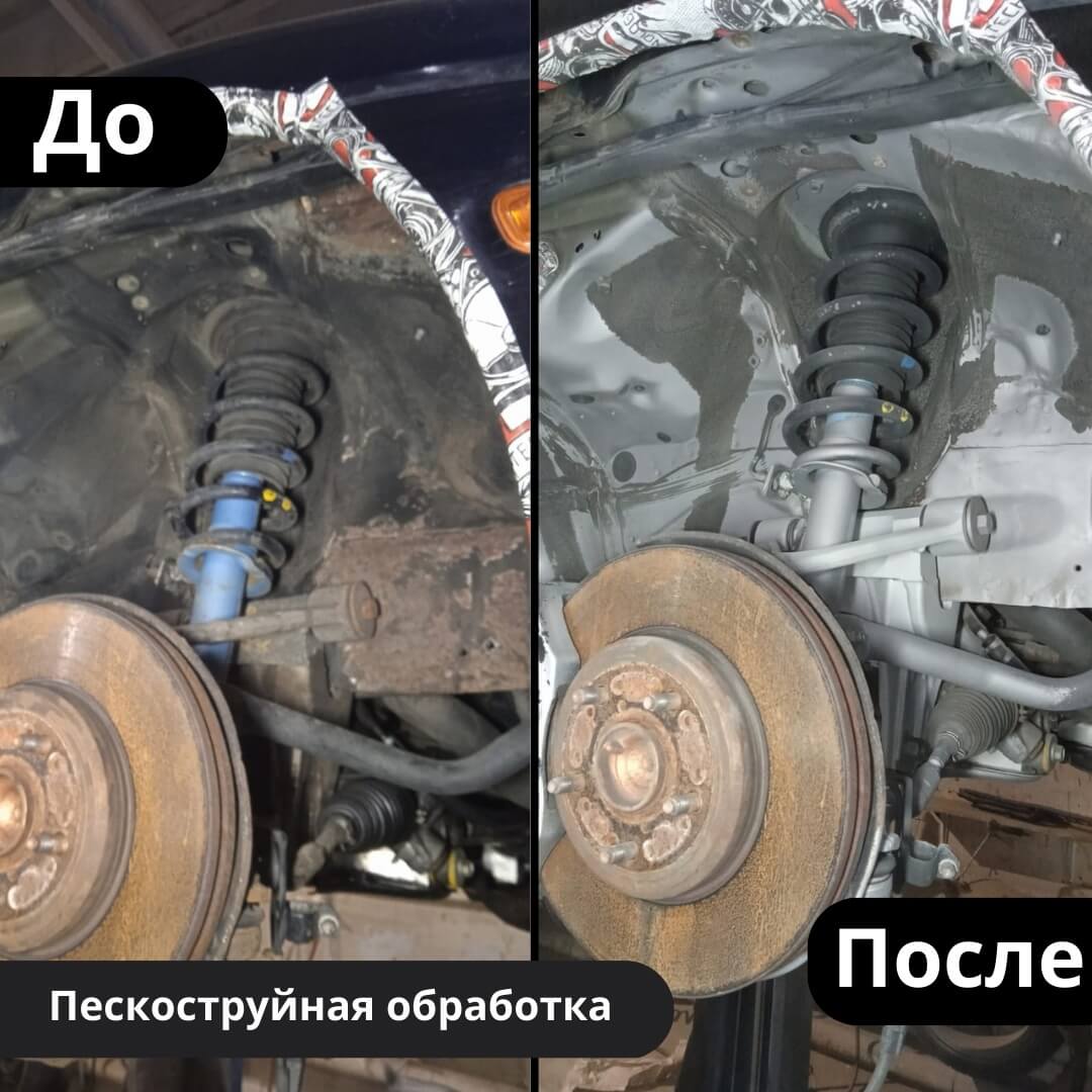 Мы произвели следующие работы: 1. Мойка с разбором и сушка 2. Пескоструйная обработка днища 3. Цинкование 4. Обработка скрытых полостей 5. Антикоррозийная обработка 6. Покраска подвески