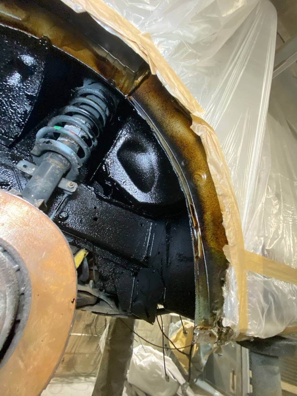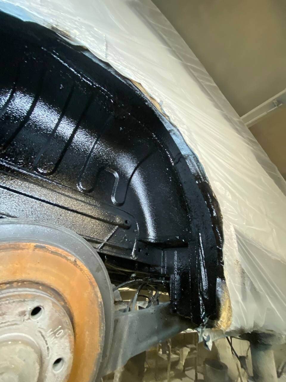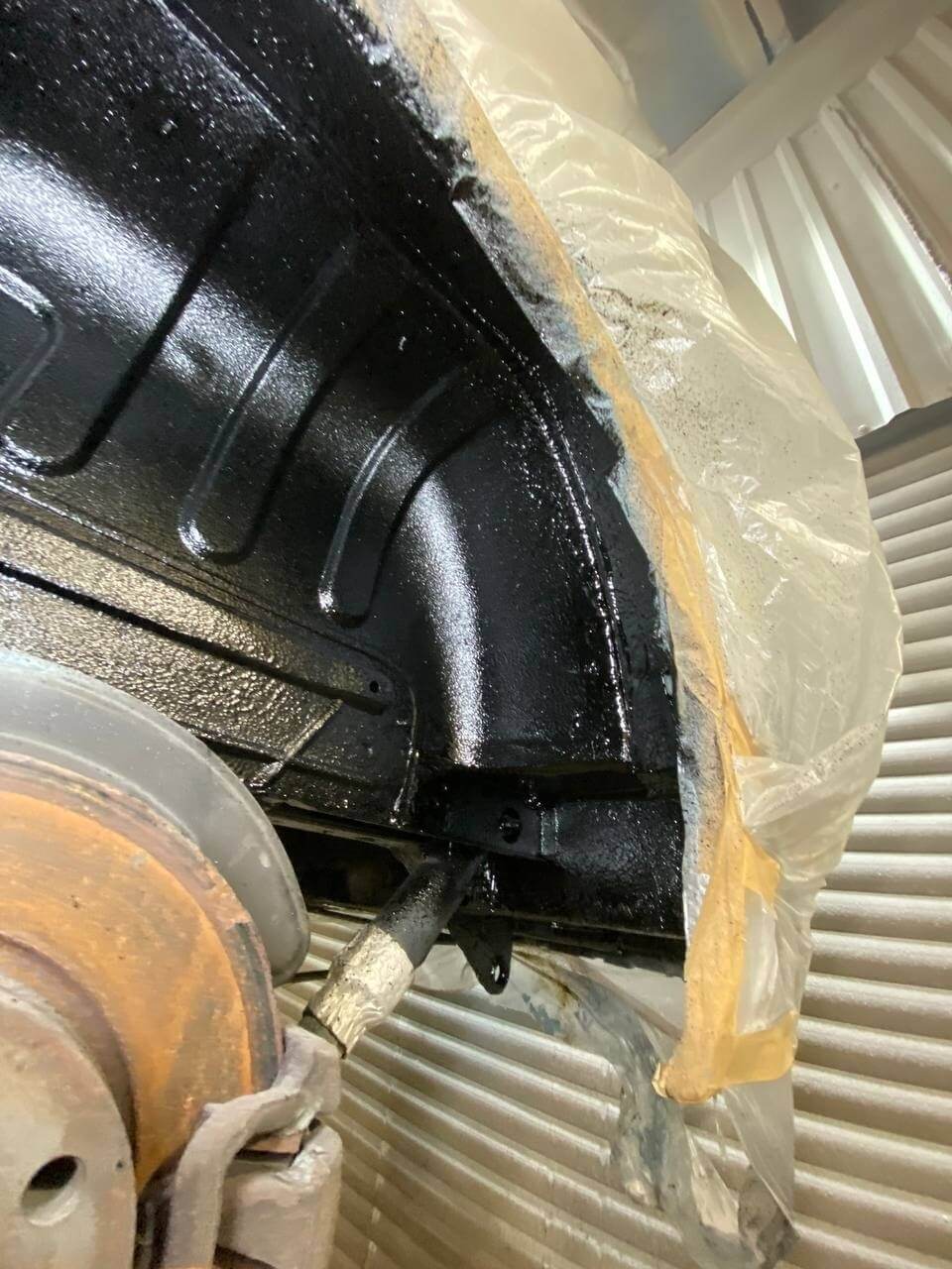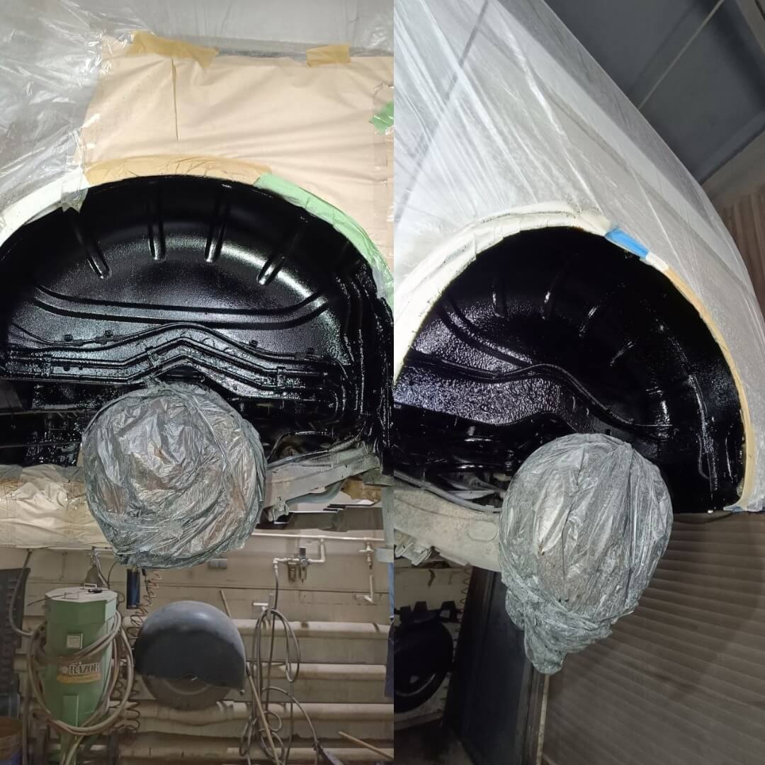 Далее нанесли антикоррозийный состав Mercasol 845. Колесные арки обработали составом Noxudol 1600UM - для антикора и шумоизоляции.