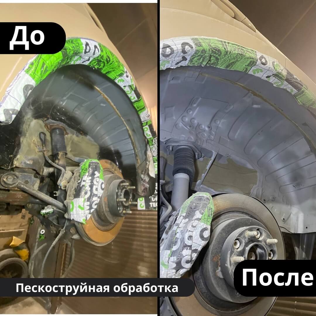 📝Мы отмыли и высушили автомобиль, далее приступили к пескоструйной обработке днища. Следующим этапом стало нанесение цинкового покрытия методом холодного цинкования и обработка скрытых полостей воско-масляным составом Mercasol 831ML. Далее мы нанесли антикоррозийный состав Mercasol 845. Также арки автомобиля обработаны составом Noxudol 1600, который кроме антикора даёт шумоизоляционный эффект.